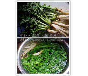 将萝卜菜去掉老叶清洗干净,用刀将萝卜划开(如图),干净的盆子烧开水,压入萝卜菜,烫得叶子变得碧绿捞出冲凉水;