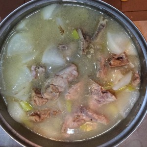 待翻炒至排骨沾满油,加入水煮,煮沸后放入白萝卜,煮沸后少量多次放盐,并试味。