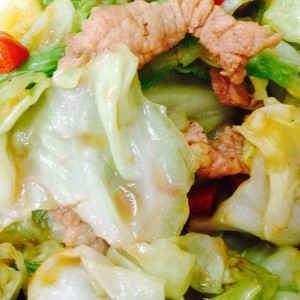 加入包菜翻炒,放入一勺生抽、一勺蚝油,继续翻炒至熟,加入盐、鸡精,1/2勺醋,一点点点糖(提味)