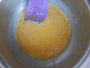 蛋黄中加入1克盐、10克细砂糖,搅拌均匀。再分次加入50克色拉油,每次加都有搅拌至水油融合。