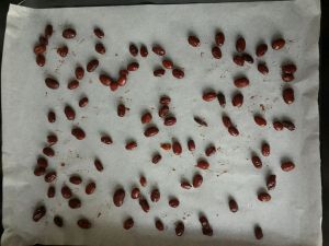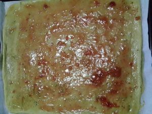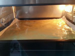 烤盘铺油纸,均匀的撒上蜜豆。(蜜豆是自己做的,量随自己喜欢,但是不能太多。)将拌好的抹茶蛋糕糊倒在烤盘上用刮刀轻轻刮平。