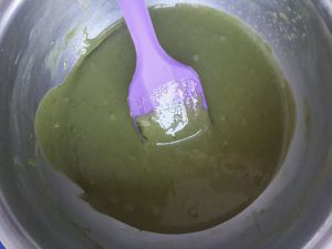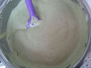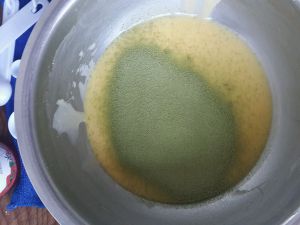 分三次与抹茶蛋糊混合成蛋糕糊,手法跟戚风蛋糕的手法相同。