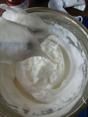 打蛋白,蛋白打至9分发。不需要太硬,以免卷的时候开裂。