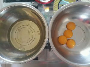 蛋白、蛋黄分开,装蛋白蛋黄的盆要无水无油。蛋白中加入柠檬汁。