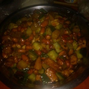 先把鸡丁炒熟,然后把土豆丁炒熟,然后在热油,加入花椒,干辣椒,炒香,加入鸡丁,加入耗油,醋,糖,然后倒入土豆丁黄瓜丁,翻炒均匀,加入花生米,就可以出锅了