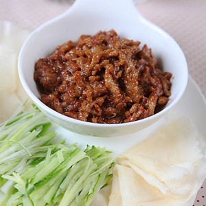 将黄瓜、大葱切细丝、春卷皮铺在盘里备用;