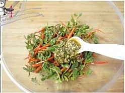 将汆烫好的马齿菜捞起冲凉开水,然后将挤干水分的马齿菜和调味料拌匀后即可食用。