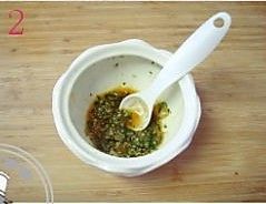 大蒜1-2瓣切碎、芫荽适量切碎放入捣盅,加一点盐、适量熟白芝麻捣成泥;