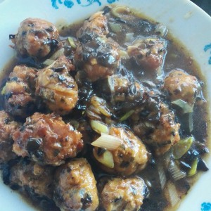 锅留底油,放入葱花,木耳碎炒香,放入五香粉,酱油,一碗水,煮开之后放入盐,一定少放,丸子里已经放盐了,糖,醋,味精翻炒几下,调入水淀粉,浓一点,放入丸子翻炒几下出锅,吃饭了