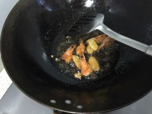 锅内倒入适量油,油热加姜片炒出香味,倒入虾头,炒出红油(炒出红色虾膏)