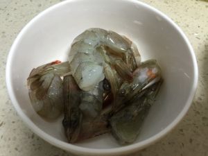 鲜虾洗净,去皮,挑出虾线(可选择开背),头尾分开,备用。