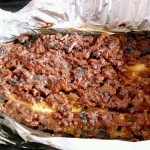 茄子划开,填入肉酱,烤箱190℃烤10分钟即可。