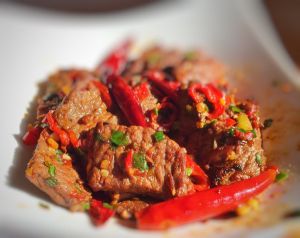开大火,快速倒入牛肉,用锅铲拨开避免结块,翻炒20秒。倒入葱末,加盐、料酒、糖醋汁。辣椒、胡椒粉等因人而异。牛肉下锅后大约两分钟完全变色就可出锅。