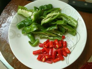 在闷煮过程中,准备青椒,红指天椒(看个人喜不喜欢辣),给菜增加菜色,