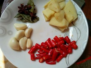 准备好配料,蒜子,红指天椒,姜切片,八角香叶。