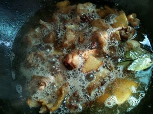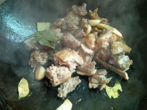 热锅后放少量油,把蒜姜片下锅爆香,倒入焯过水的鸭肉翻炒,使鸭肉里的油煸出来,放入适量盐,生抽,八角,香叶,在翻炒使香料香味都炒出来。。。。