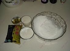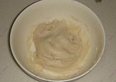 在碗里加入牛奶,糖粉,色拉油搅拌均匀后倒入糯米粉,大米粉,澄面,充分搅拌均匀。