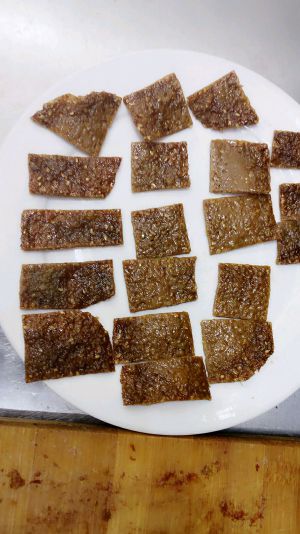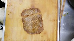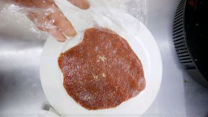 这个已经擀好,保鲜膜撕了,然后反放入盘中把另一层保鲜膜也撕了。这里撕得时间尽量温柔点,肉容易散!