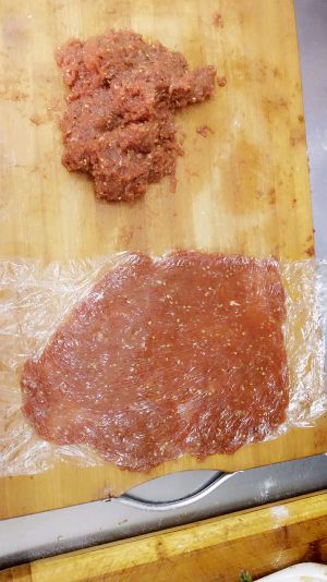 差不多已经完成一半了。这个已经放入保鲜膜了!平铺一层保鲜膜然后放一团肉,封层保鲜膜,家里任何圆柱体的东西都可以拿来擀肉饼啦,不要笑我,实在找不到东西,直接把扫把拆了!擀擀擀,越薄越好!