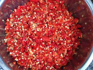 水份晾干后把辣椒尽量的剁碎,我这一斤辣椒足足花了半个小时才剁好哦,可还是不够碎。现在市场上也有专门碎辣椒的设备,亲们可以偷偷懒噢!