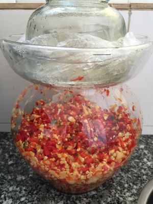 然后放入泡菜坛子里,美味的剁辣椒就做好了。最好选这种坛口可以放水的坛子,这样就不会因为进空气而使辣椒长霉了,可以在盖子下面垫一层薄塑料再盖上,这样就万无一失了