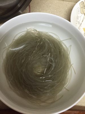 红薯粉取一小把,热水泡半小时左右,泡软后剪短待用。