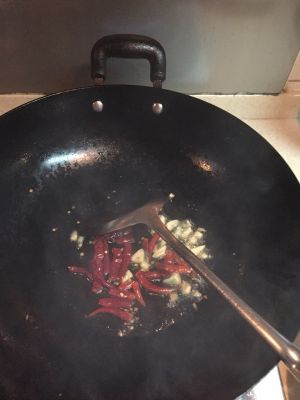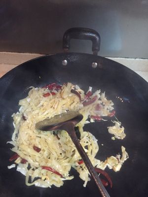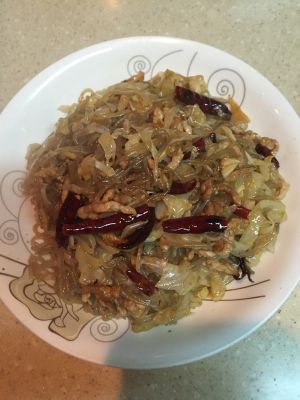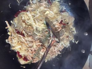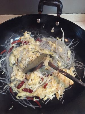 加入苕粉(红薯粉)翻炒,加入适量的生抽(两勺左右)加水盖上锅盖焖两分钟。