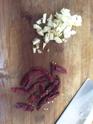 准备辣椒切段,蒜切片。可添加小葱或大蒜叶切段使菜更香。