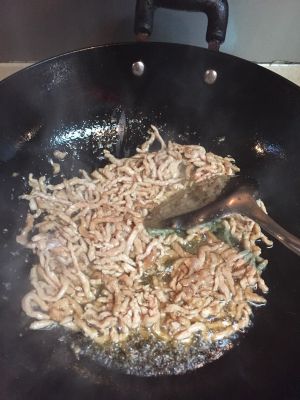 冷油中火放入肉丝翻炒片刻变色盛出。