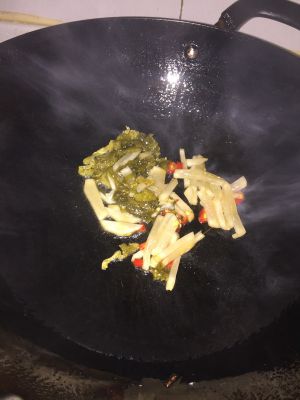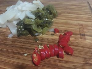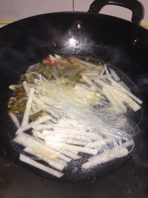 酸菜酸萝卜,小米辣切碎,粉丝用水泡发