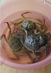 蟹回来放清水里养半个小时,再用刷子仔细刷干净整个蟹,重点把蟹钳这里绒毛中的脏东西洗干净。沥干水份待用