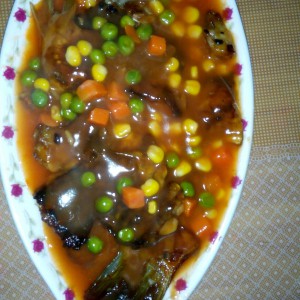 油五成熟放入鱼头炸,关小火,此时注意摆好造型,定型后炸侧面