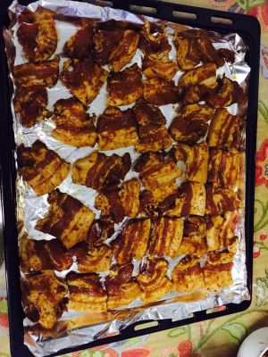 把肉切成薄片,放入以上材料腌渍。1小时。摆在烤盘上。230度。上烤。20 分钟。
