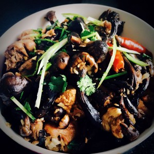 鸡肉压好后取出,汤不要扔掉,油锅感觉热了下葱花和姜爆香,我现在基本都把葱花和香菜爆到焦,取出不要。
