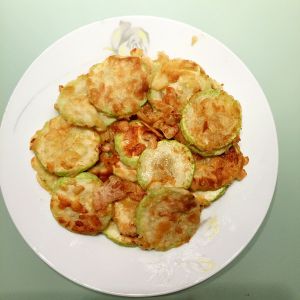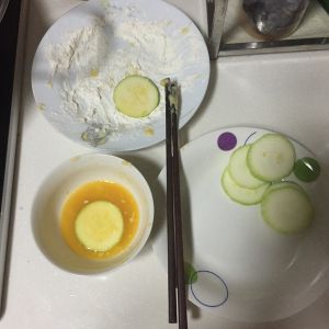 鸡蛋打散加入盐、胡椒。面粉平铺在盘子里。西葫芦去皮切成5毫米以内的片。西葫芦片蘸满蛋液再在面粉盘里两面滚一下。
