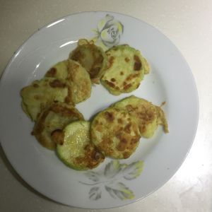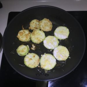 平底锅放入少许油,再把蘸好蛋液和面粉的西葫芦放在锅里小火两面煎熟