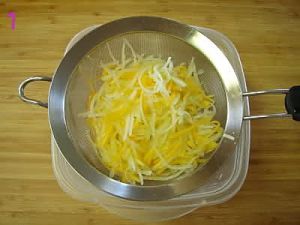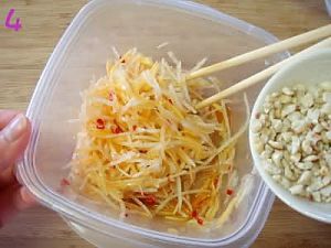 青木瓜洗净去皮去籽,切成丝状,放入冰水(水里加入适量糖)里浸泡10-15分钟,捞起沥干水份;