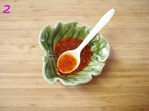 将鱼露、糖、青柠檬按照1:1:1.5的比例调和,加入适量是拉差香甜辣椒酱、辣椒粒、蒜蓉拌匀成为料汁;