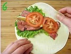 将墨西哥面饼稍稍烤热,每一块墨西哥面饼上依次放上生菜叶、牛肉片、大葱片、西红柿片,卷起即食。