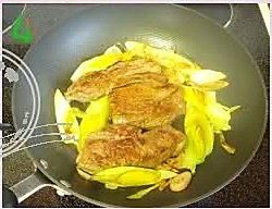 3: 锅里放入适量橄榄油、黄油烧热,将大葱片、姜片、红葱头片放入锅内2面煎黄煎出香味;