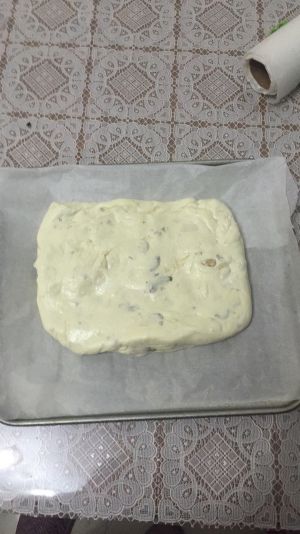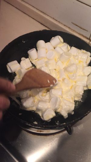 将黄油放不粘锅融!然后倒入棉花糖!小火搅拌均匀!再倒入奶粉,搅拌下!再倒入果仁(我放的杏仁。葡萄干还有松子仁)即可关火,揉成团!