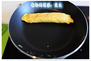 待第2次倒入的蛋液表面稍微干了后,再用锅铲向自己的方向一点点卷动,使蛋卷沾上第2次的蛋液慢慢形成更整齐的大一些的鸡蛋卷。等蛋卷卷到锅边缘后,推其到锅的另外一边。用纸巾擦净锅后,将火关闭。