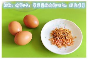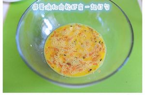 把鸡蛋打倒一个大碗里,加入肉松虾皮后一起搅拌。