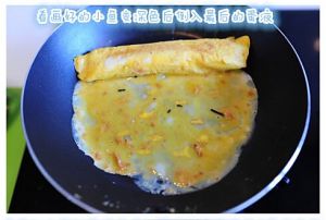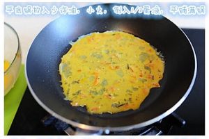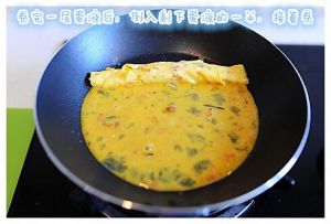 平底锅放入少许油,加热后转小火,将1/3的蛋液倒入锅中。转转平底锅,使蛋液能够均一平铺炒锅。