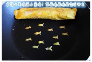用筷子蘸些蛋液在锅上画出小鱼图案。画好后开小火,见画出的小鱼图案变深色后倒入剩下的全部蛋液。