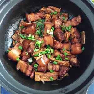 锅内留少量油下姜片,五花肉稍稍翻炒,加老抽上色,烹入大量料酒或黄酒,添少量水,加入八角、桂皮等香料,入干辣椒、小葱,加入冰糖及少许醋,醋不宜多,不需要酸味,加入醋可以使得肉质偏松软,不会硬。转移到砂锅内。小葱不需切碎,整根这一下,稍稍缠绕捆扎就行。