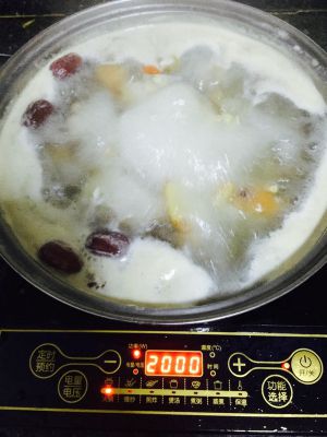 水沸后加入枸杞,大枣,党参继续烹煮,大火煮15分钟后放入莲藕,然后一直点煲汤火候一直煮45分钟,喜欢软糯一点的朋友也可以炖久一点,1个小时,中间水煮干了可以加水,一直持续关注锅内情况,及时清理浮末,放入盐,味精,鸡精提味。