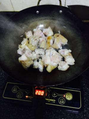 锅中放入适量食用油,油烧热后倒入猪蹄爆炒,然后放入事先准备好的水。