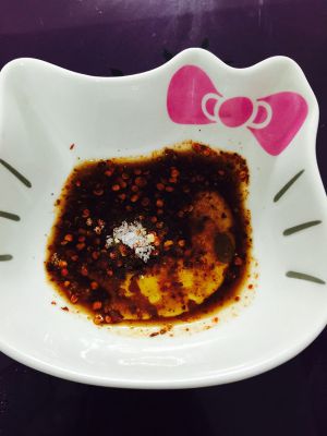 制作蘸料,干辣椒面,放入盐,味精,鸡精,醋,香油,搅拌待用。☺
