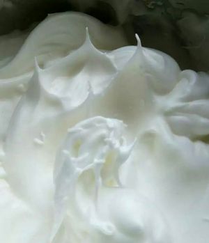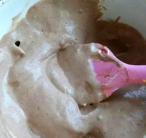 按照普通八寸可可戚风蛋糕的做法,混合好蛋黄糊,打发蛋清到硬性发泡。用料里标注的是做两个八寸可可戚风的用量